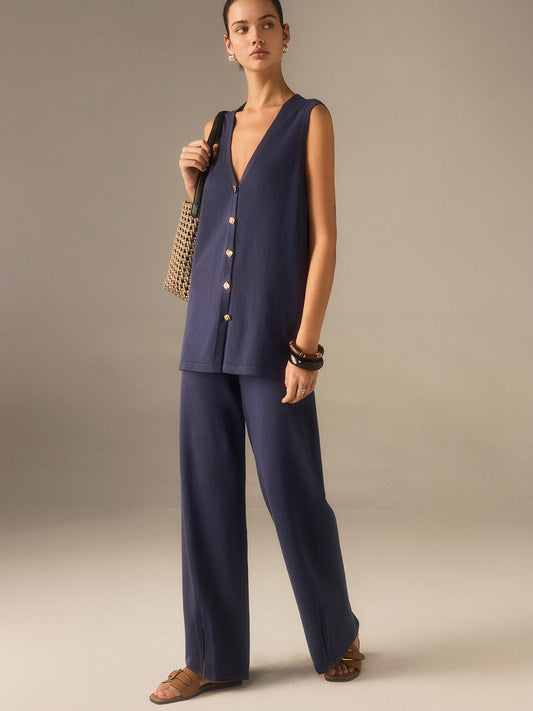 Conjunto de chaleco de punto con botones dorados y pantalones de pierna ancha – LUMINA